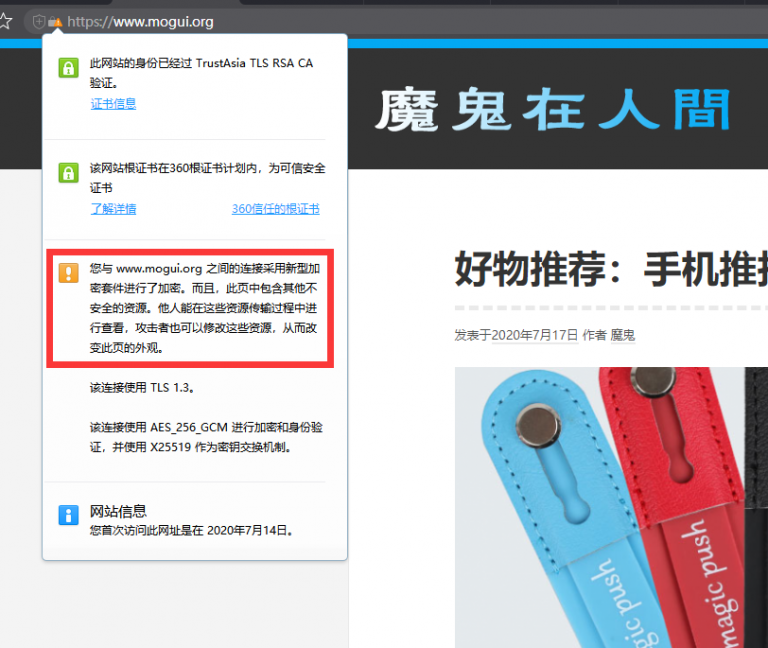 如图所示,上面的HTTPS的小锁正常应该是绿色的状态,百度了一下说是页面中含有不安全的链接,我已经全部清理掉了,但是还是这样,暂时还没有解决,继续想办法吧。